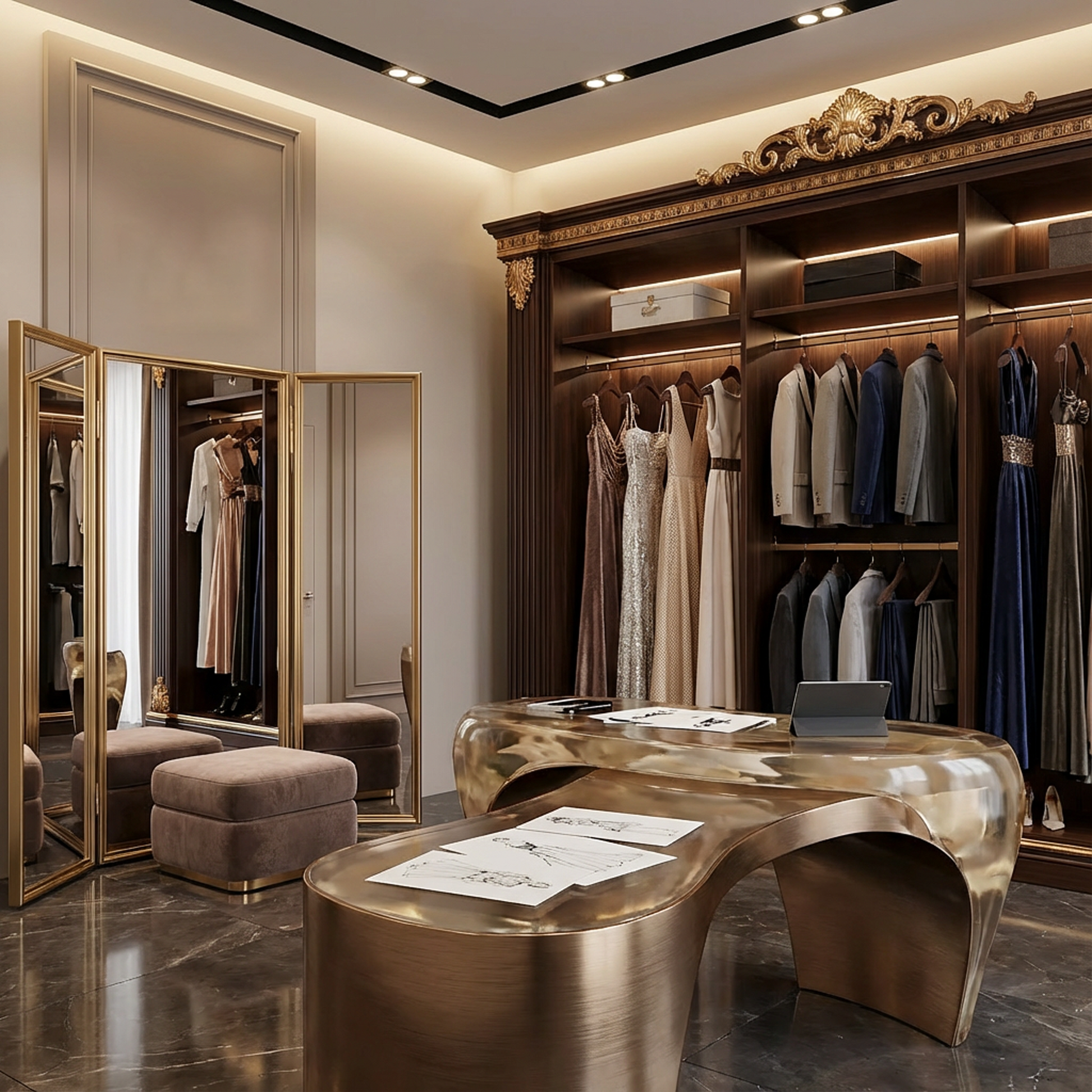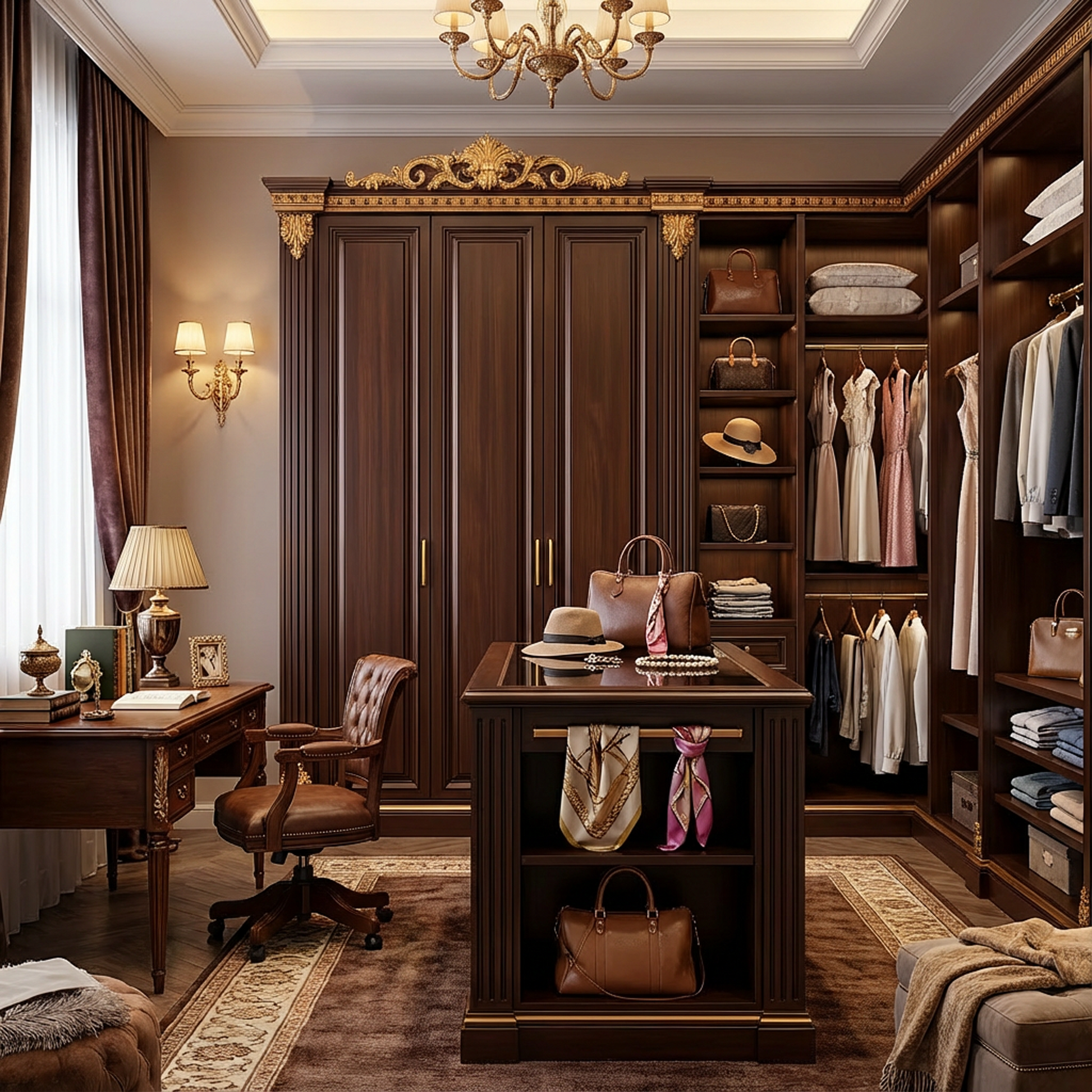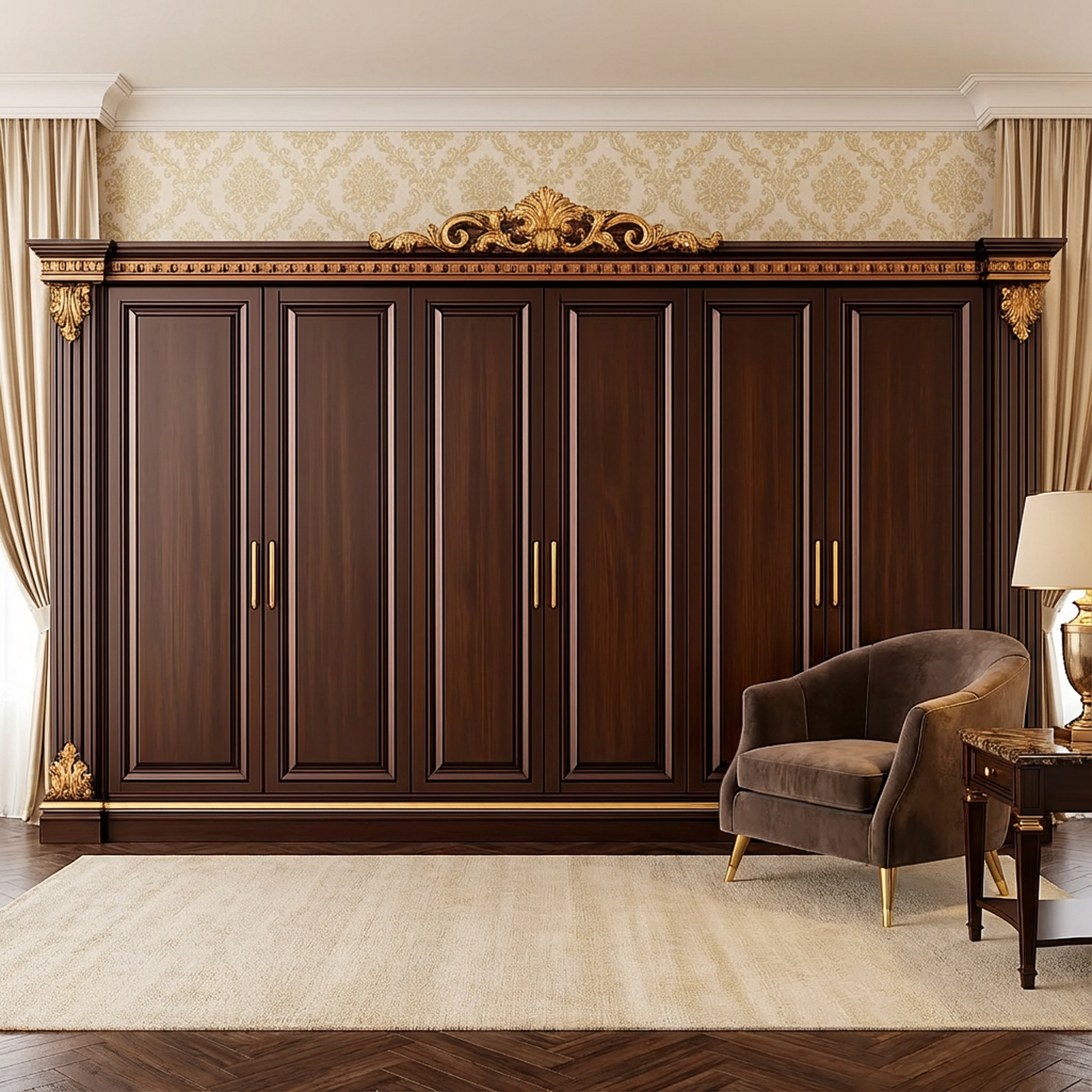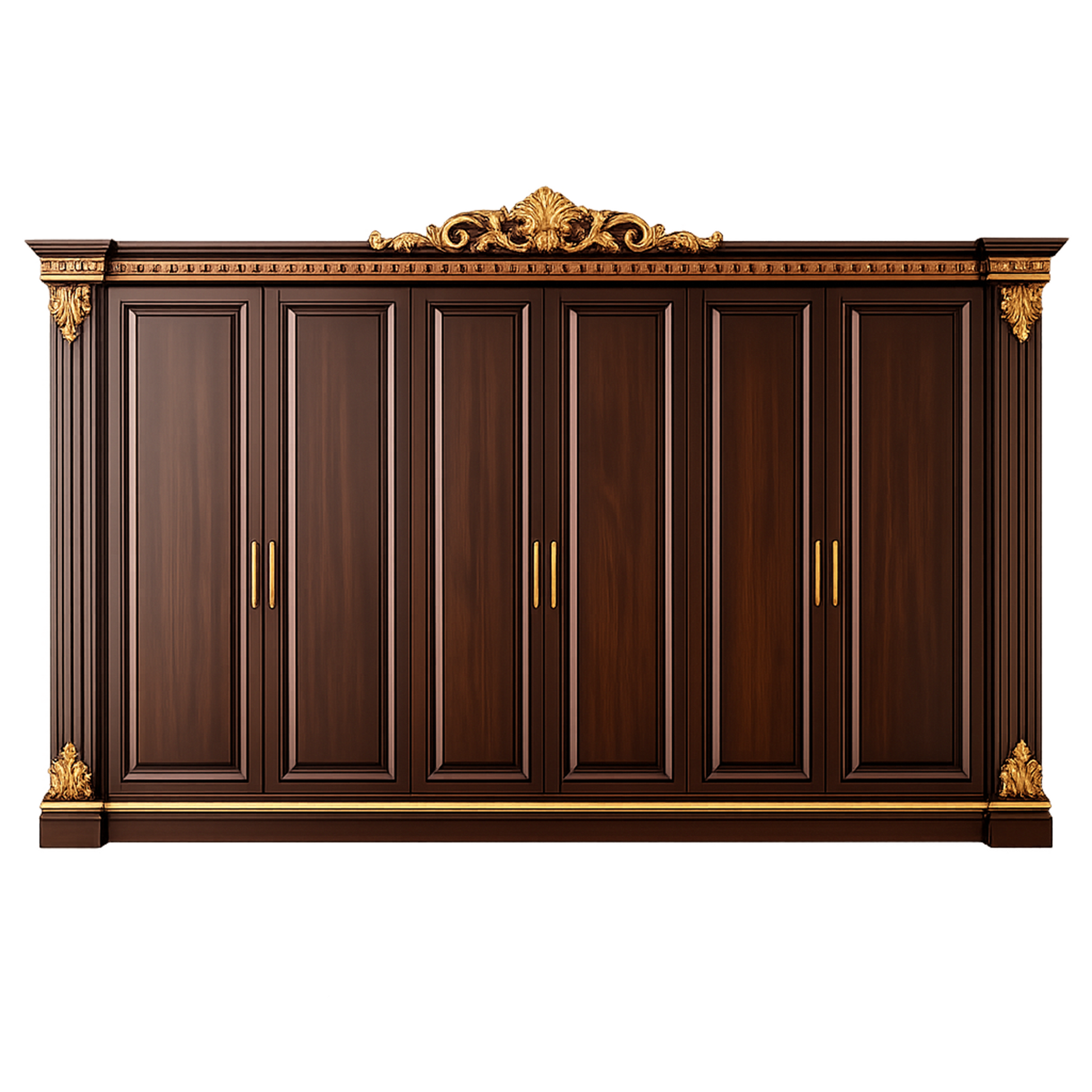 Bring timeless European elegance into your space with this Neo-Classical 6-door wardrobe cabinet. Finished in a deep walnut tone and accented with gold ornamental carvings, it delivers a refined “grand residence” look while keeping everyday storage beautifully organized. The symmetrical panel doors and sleek gold handles create a clean, formal presence—ideal for bedrooms, dressing rooms, or statement storage in upscale interiors.