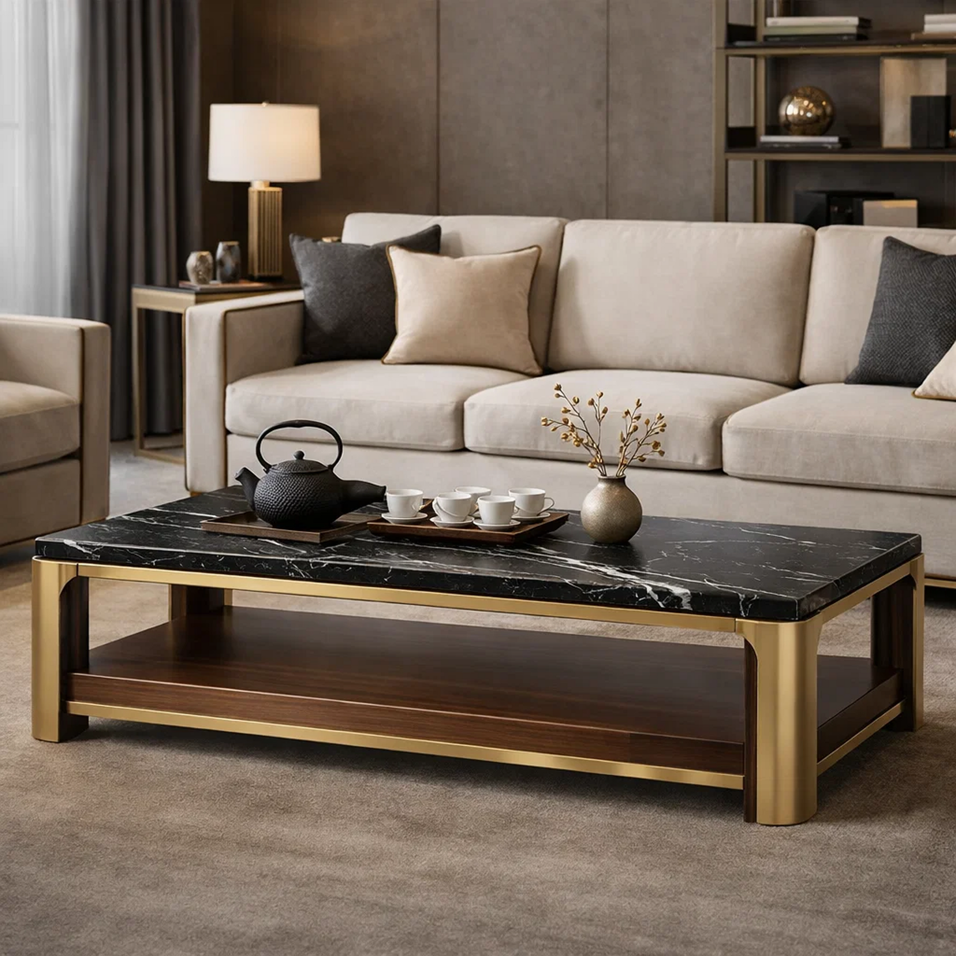 Elevate your living room with this modern luxury coffee table, featuring a bold black marble-look top paired with a sleek champagne-gold metal frame. The open lower shelf in a warm wood tone adds both contrast and practical storage—perfect for books, trays, and everyday essentials. Clean lines and rounded corner detailing create a refined, hotel-lounge aesthetic that fits contemporary and upscale interiors.